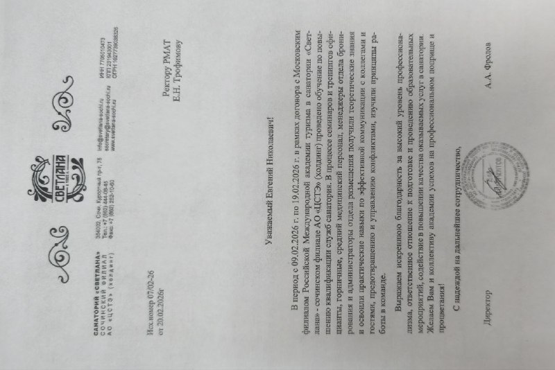 Руководство санатория «Светлана» высоко оценило работу экспертов и направило в адрес ректора РМАТ Е.Н. Трофимова благодарственное письмо.